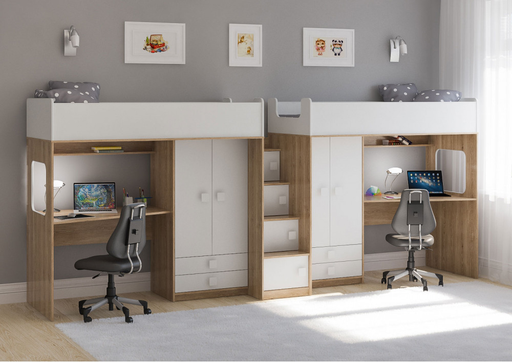 Под спальным местом для каждого ребенка располагается рабочее место с встроенным столом.