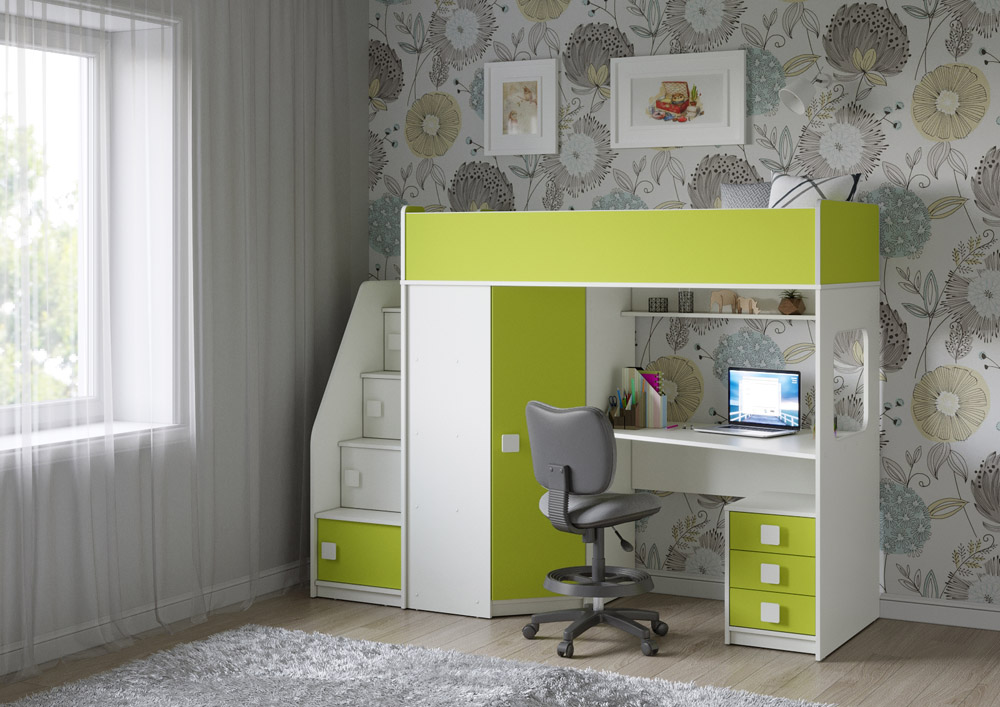 Учебная зона со столом под спальным местом открывает возможности для письменных работ, а также здесь удобно расположить ноутбук. Тумба Л-04 обеспечит хранеие канцелярских принадлежностей и учебников.