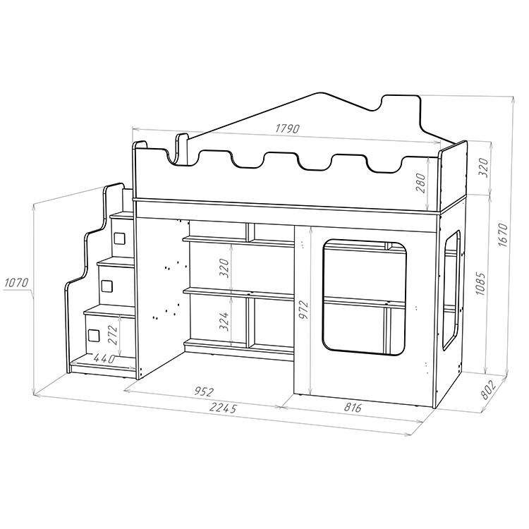 Под кроватью находится большая игровая зона, которая будет особенно интересна для детей. А фронтальная стенка со световым окном создаст атмосферу уюта и волшебства. Мягкий противоударный кант на бортах кровати и лестницы предотвращает возможные травмы и обеспечивает безопасность использования кровати-домика.