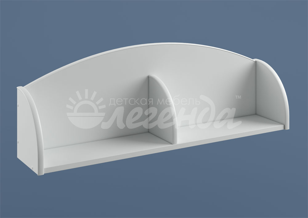 Небольшая практичная белая полка Л-08 из двух секций с разделителем по центру и ограничителями по бокам – таким образом,содержимое полки предохранено от падений,на ней удобно располагать книги и другие небольшие предметы.